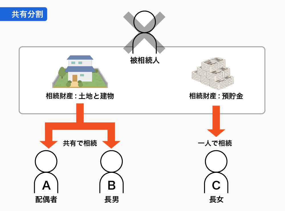 相続人が3人いて、1人が預貯金を相続し、残りの2人が不動産を共有で相続するケースなどがこれに当たります。