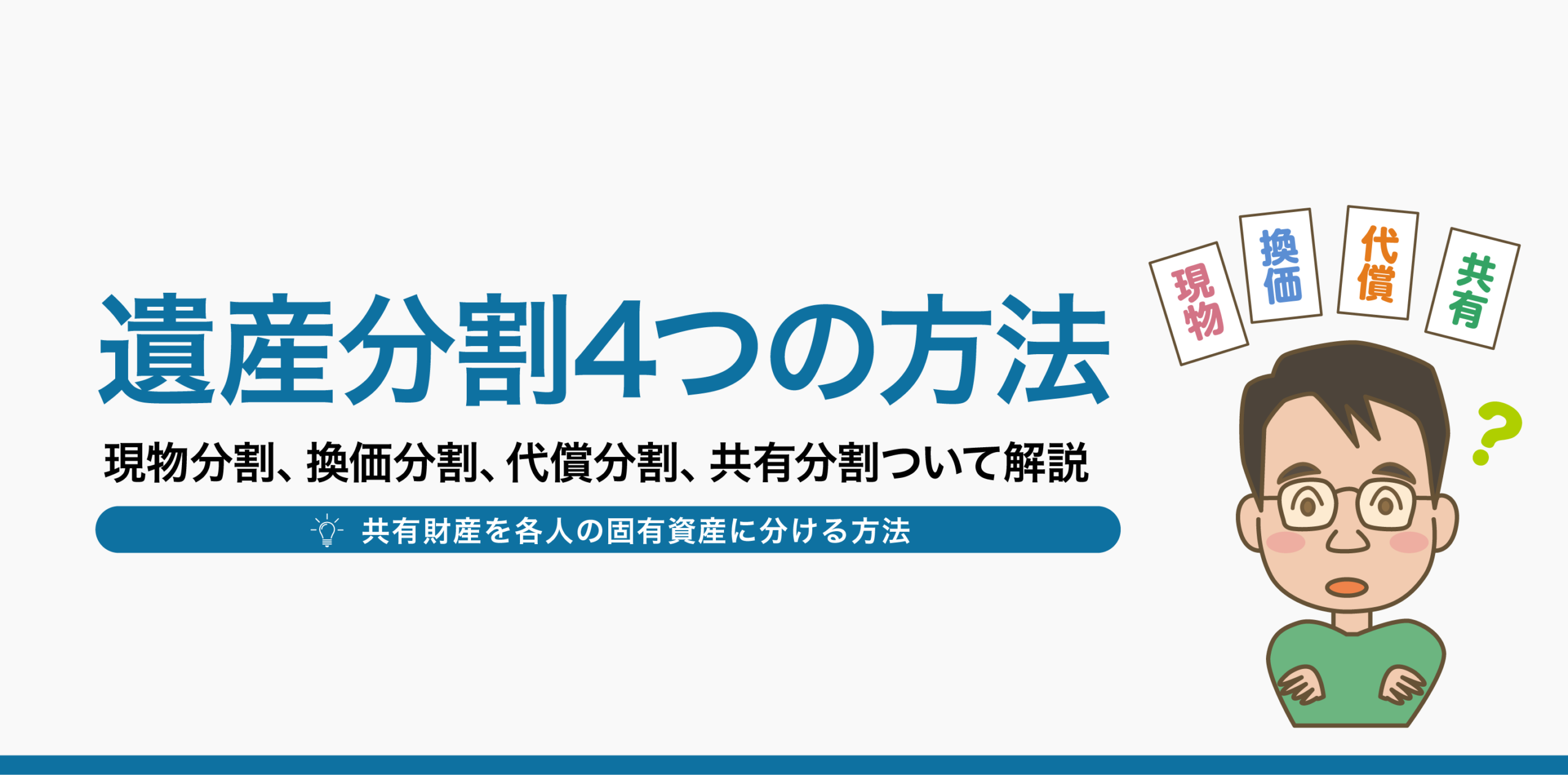 - 遺産分割には4つの方法(現物分割、換価分割、代償分割、共有分割)があります。