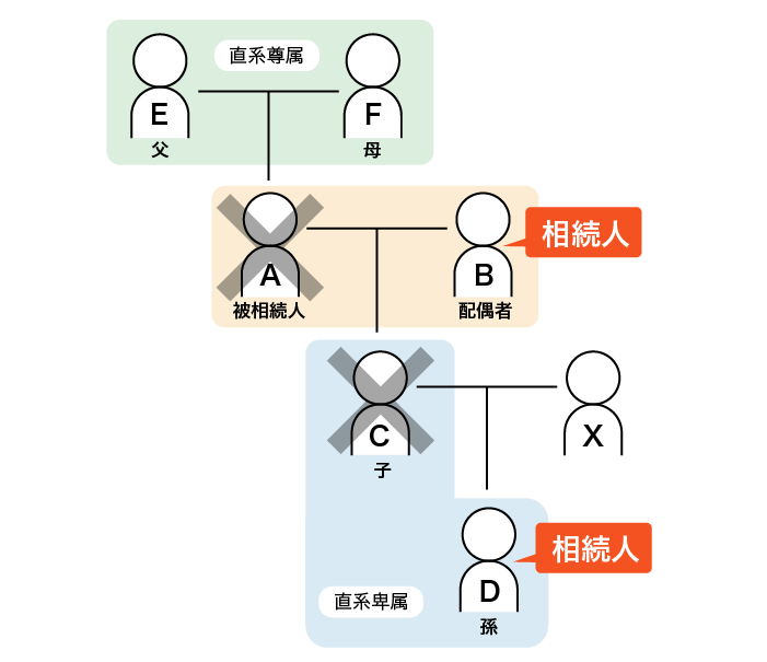 ○Dは第1順位の血族相続人です。 - 第2順位の父E、母F、並びに子の配偶者Xは相続人ではありません。