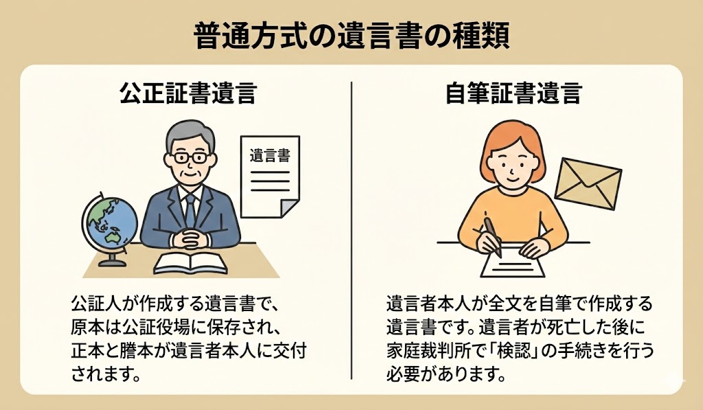遺言書にはいくつかの種類がありますが、一般的に利用される「普通方式の遺言書」には次の2つがあります。
