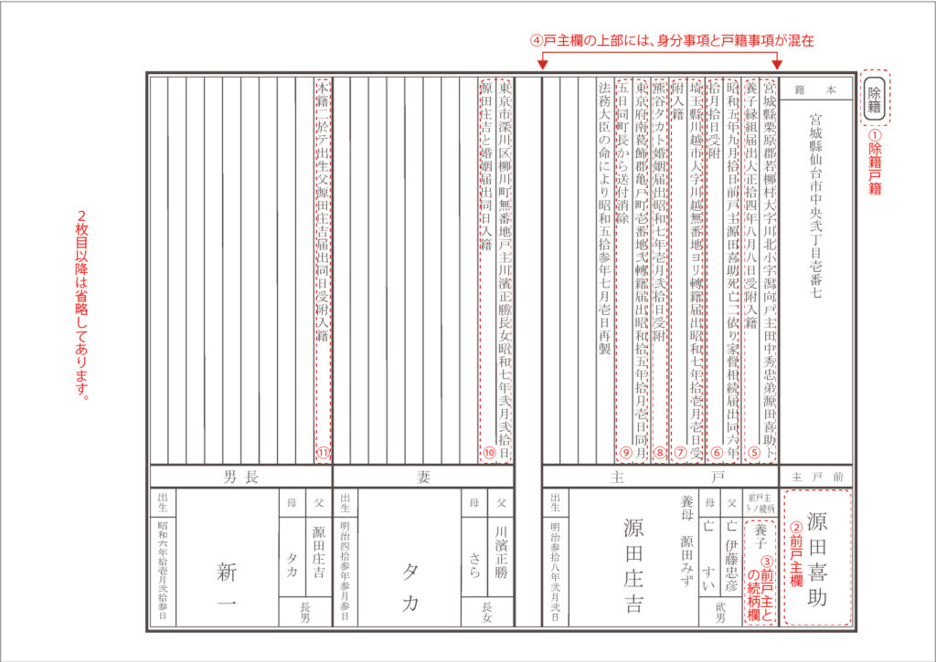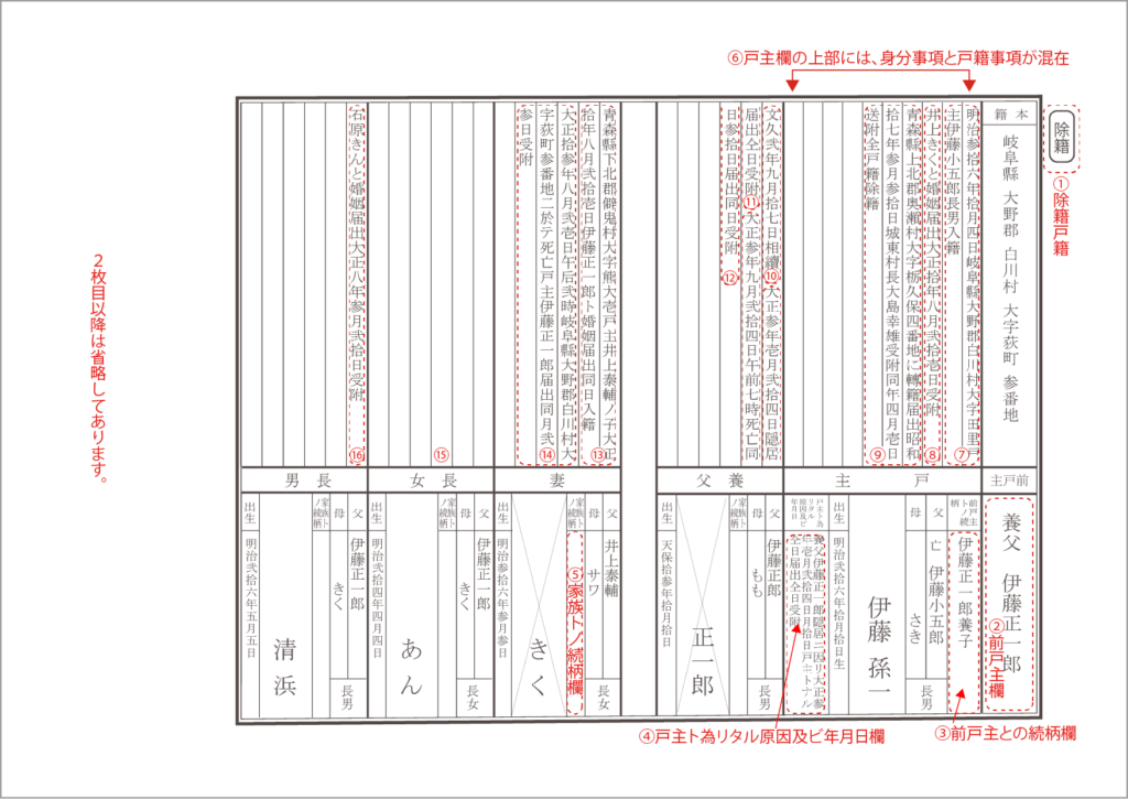 2. 当時の戸籍には、現在では使われない続柄や身分の区別、独特の用語が多く用いれられていた。