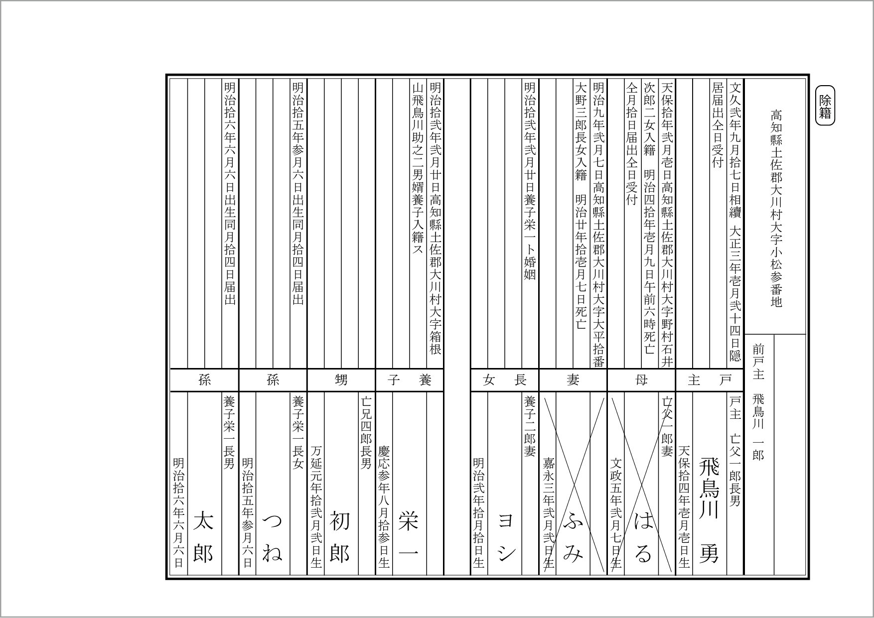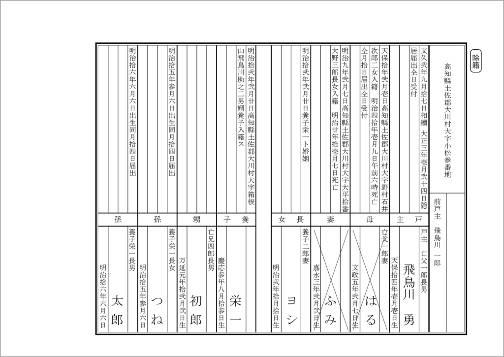 戸主「飛鳥川勇」戸籍で、文久2年9月17日に相続で戸主になり、大正3年1月24日に隠居しました。(他の親族については省略します。)