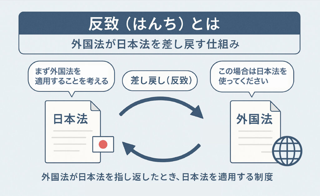 「反致(はんち)」とは、外国の法律を適用しようとしたときに、その外国の法律が「日本の法律を使うべきだ」と定めている場合に、日本法に戻して処理するという仕組みです。つまり、法律の“押し返し”のようなものです。