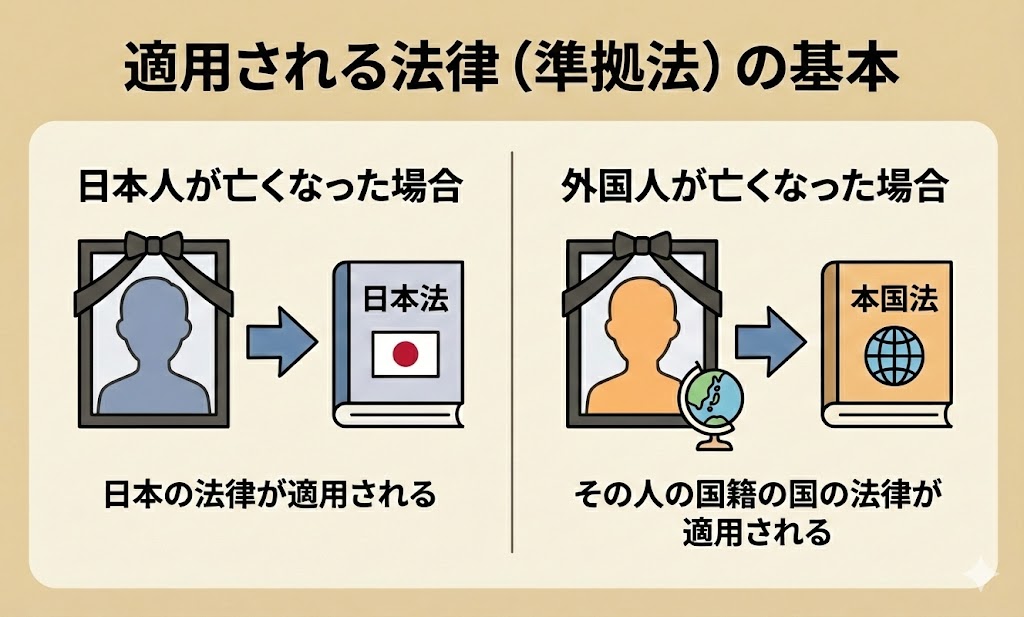 ・日本人が亡くなった場合 → 日本の法律が適用されます。