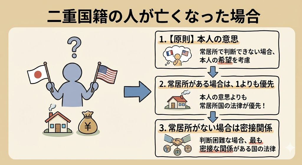 二重国籍を持つ人が亡くなった場合、その相続に適用される法律(本国法)は、まず 本人がどちらの国の国民として扱われたいかという意思によって決まります。