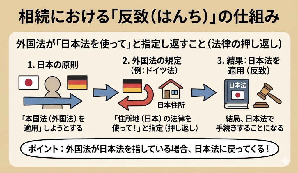 ところが、ドイツの国際私法では「相続は亡くなった人の住所地の法律による」と定められているのです。 この場合、ドイツ法が「日本の法律を使うべき」と指していることになるため、結果的に日本の法律に“反致”され、相続は日本法で処理されることになります。