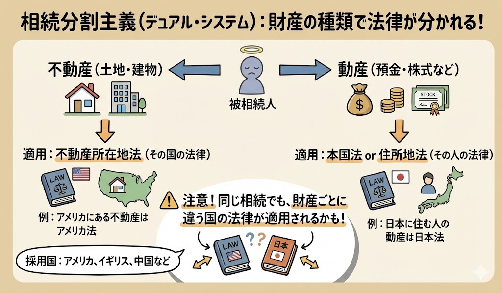 国によっては、相続財産の種類によって適用される法律が異なるという考え方を採用している場合があります。