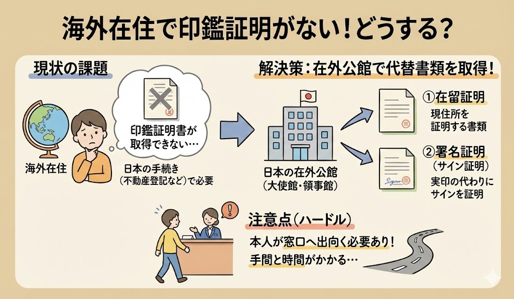 外国に在住で印鑑証明書が取得できない場合には、日本の印鑑証明書の代わりとして、在外公館(日本大使館・領事館)が発行する 「在留証明」 と 「署名証明」 を利用することができます。 ただし、これらの証明書は 在外公館の窓口で本人が申請する必要があるため、現地の大使館や領事館まで出向かなければならず、手続きは容易ではありません。