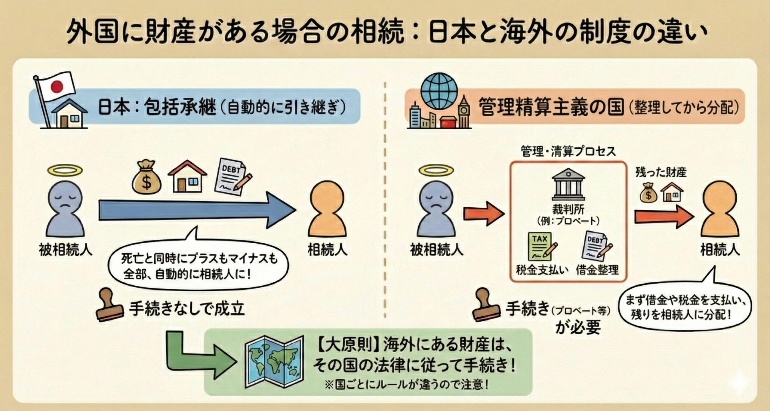 こうした仕組みは、「不動産はその国の主権に強く関わる」という国際法上の原則(領土主義)を反映したもので、海外に財産を持つ人の相続では、実務上の重要な注意点となります。