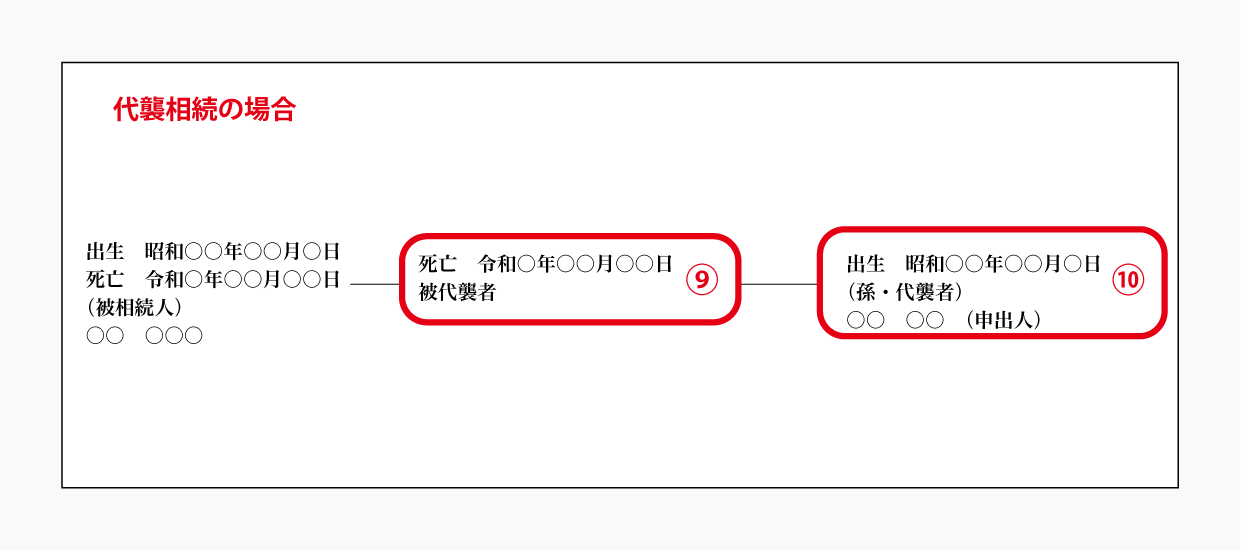 ⑨被相続人の亡くなった子について死亡日と「被代襲者」を記載し、