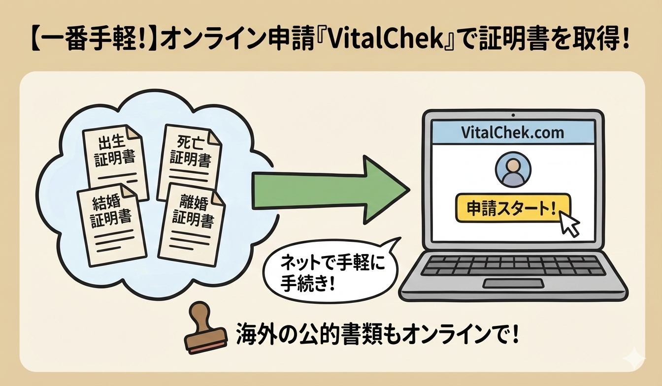 - VitalChekは日本からでも利用でき、死亡・結婚・離婚証明書をオンラインで申請可能。